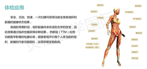 “熱斷層(TTM)技術(shù)”作為一種被動接收人體組織細胞代謝熱,以功能學(xué)為主的醫(yī)學(xué)影像設(shè)備,在醫(yī)學(xué)影像界首次實現(xiàn)了圖像自動分析,無需醫(yī)生解讀圖像,可在一分鐘內(nèi),快速提供健康檢查結(jié)果。